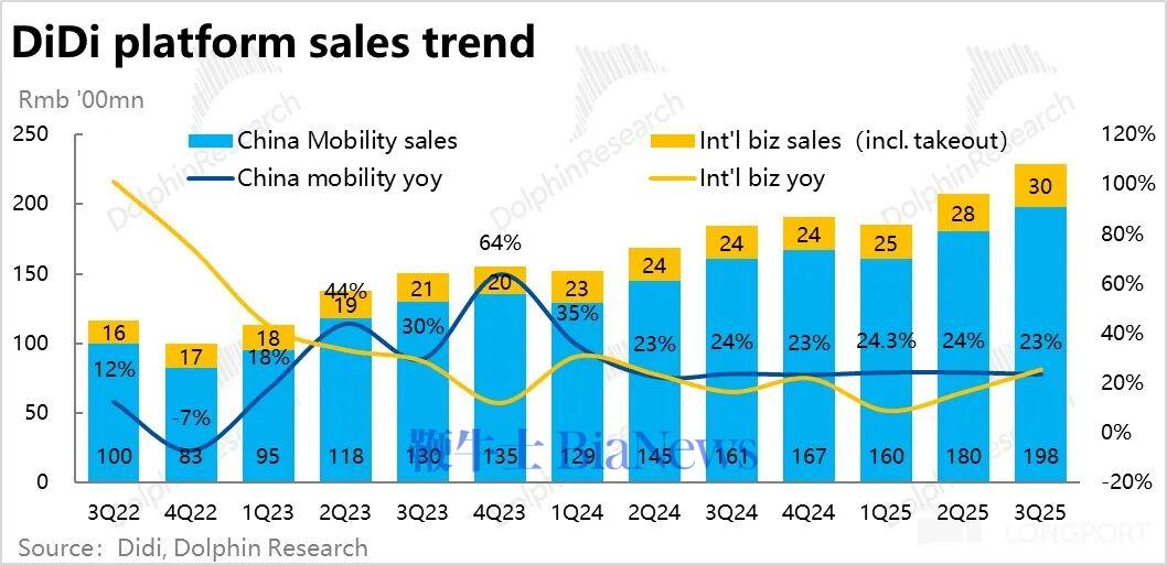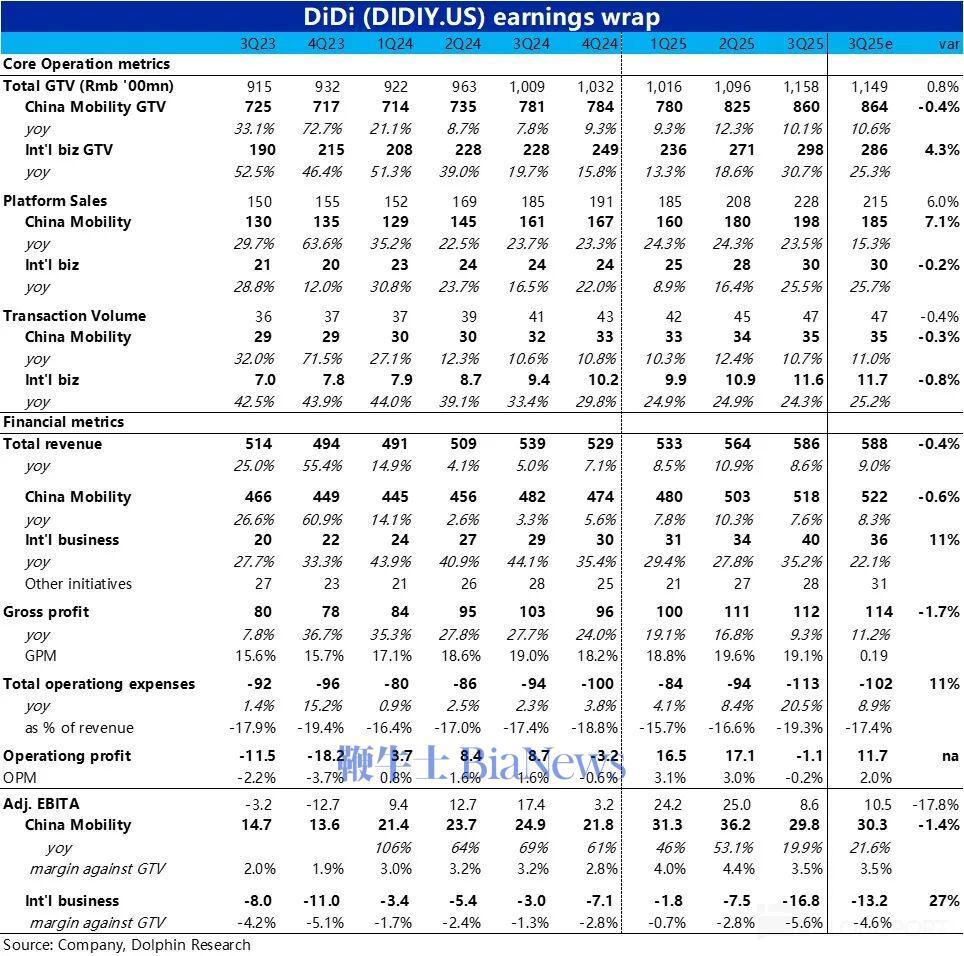 网约车龙头滴滴,于 11 月 26 日晚美股盘前公布了 2025 年 3 季度的业绩。11 月初,滴滴在小范围沟通的指引中,提示市场本季度国内业务的利润率会有所下滑,而海外则因巴西外卖投入、亏损会大幅扩大。随后滴滴股价回调了近 20%,大体消化了这个坏消息,实际业绩的表现则基本符合新指引。具体来看: