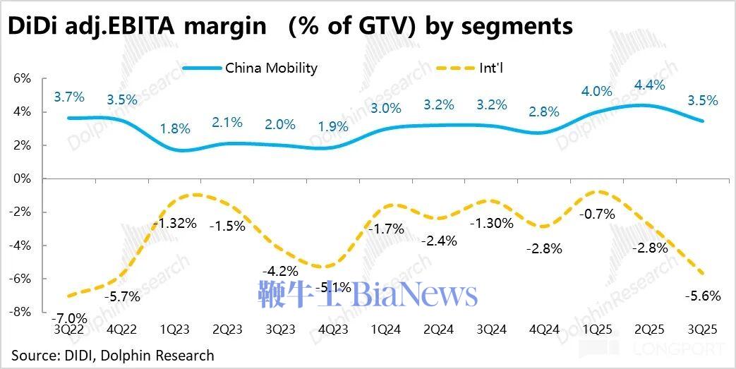 3、国内利润率环比明显收窄:海豚君认为由于国内整体需求的走弱,滴滴对应增加了在国内的补贴和获客投入(主要体现在营销费用的暴涨),滴滴本季国内业务调整后 EBITA 利润为 29.8 亿,较上季度的 36 亿明显走低,利润占 GTV 的比重为 3.5%,同样较上季的 4.4% 明显下滑。但好在并没有在 27~28 亿的指引上给出更差的表现。